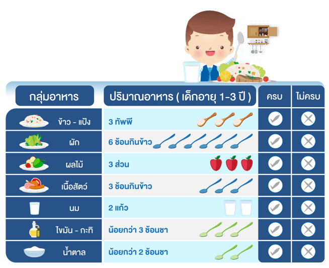 ปริมาณอาหารสำหรับเด็กอายุ 1-3 ปี ที่ควรได้รับใน 1 วัน และอาหารทดแทน