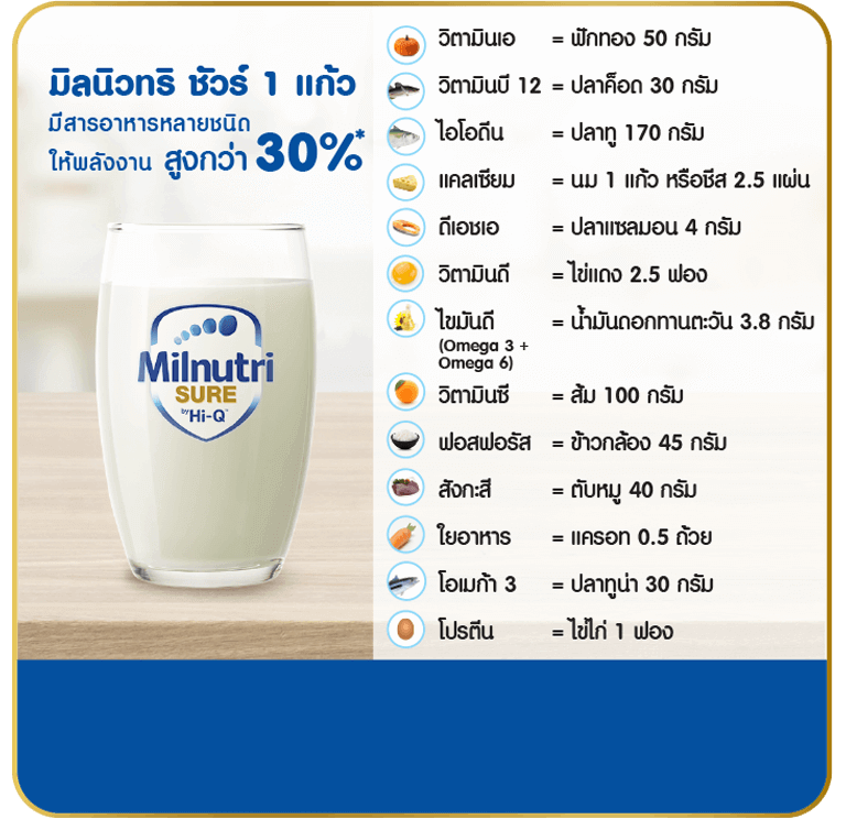 ชงเลย อร่อยง่ายๆ ได้ครบ 5 คุณประโยชน์ ผสมน้ำ 180 ml กับ มิลนิวทริ ชัวร์ 6 ช้อน